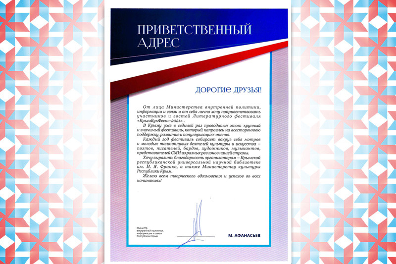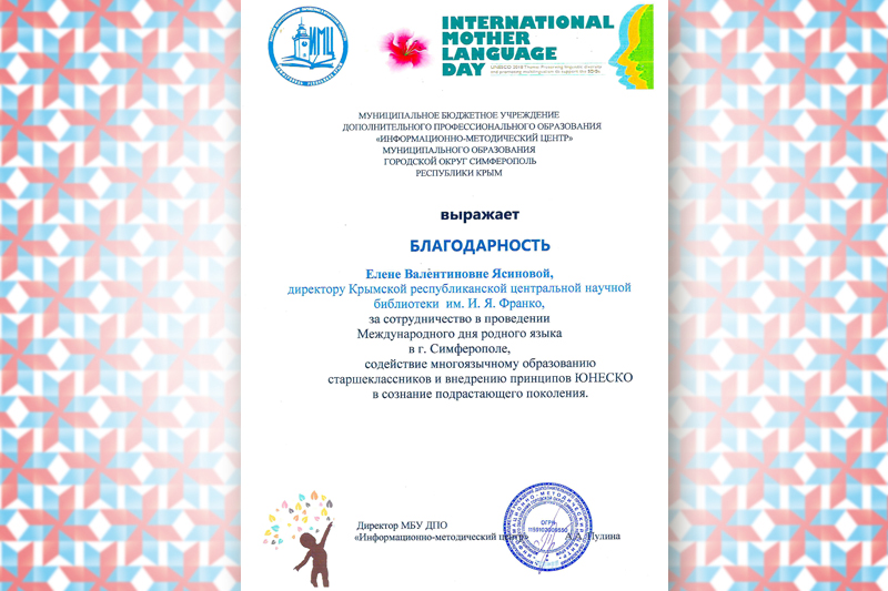 Благодарность от Крымской республиканской организации Общероссийской общественной организации инвалидов «Всероссийское ордена рудового Красного Знамени общества слепых» за оказанную помощь в проведении Крымского республиканского турнира «Что? Где? Когда?»