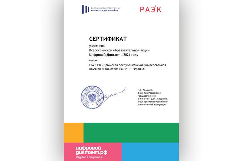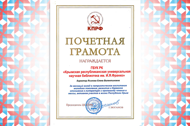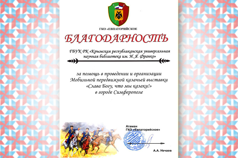 Благодарность Ясиновой Е. В. от Председателя Региональной азербаджанской национально-культурной Автономии Республики Крым Г. Г. Абасова за плодотворное сотрудничество и в связи с 35-летием со дня создания азербайджанской общины Крыма.