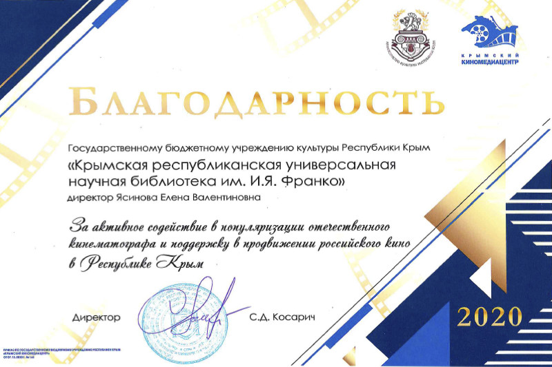 Благодарность от Председателя Благотворительного фонда развития региона «Крым-Родной-Дом» коллективу ГБУК РК «КРУНБ им. И. Я.Франко»