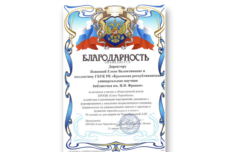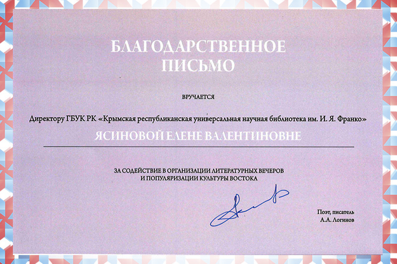 ![]() Государственное бюджетное учреждение культуры Республики Крым «Крымская республиканская универсальная научная библиотека им. И. Я. Франко» |