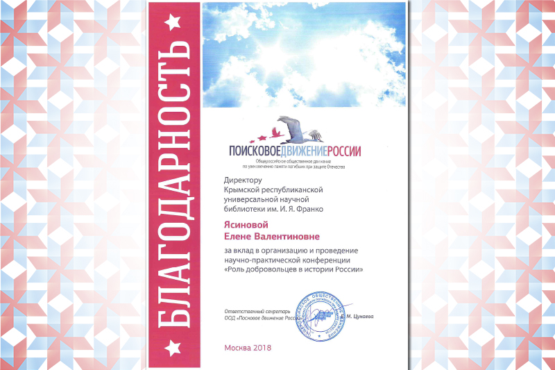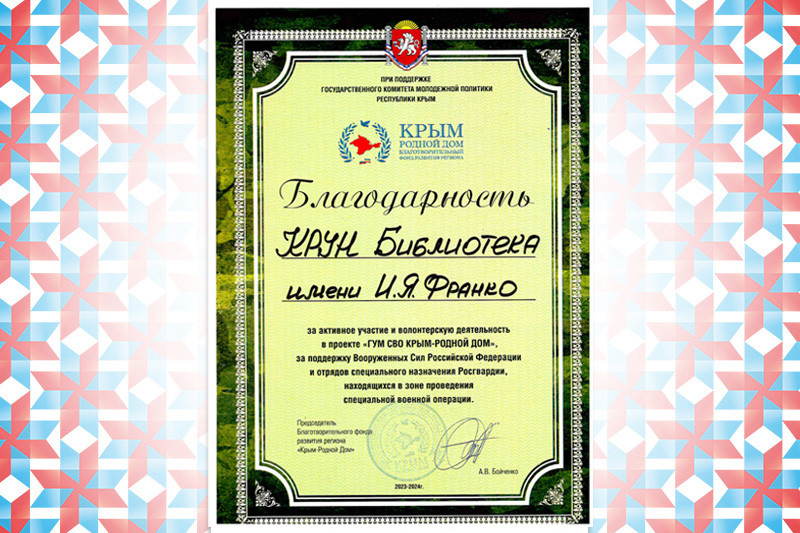 Благодарственное письмо директору ГБУК РК «КРУНБ им. И.  Я. Франко» за содействие развитию системы дополнительного образования в сфере искусств, и проведении Открытого муниципального конкурса-фестиваля «Будущее – в культуре» в 2024 году